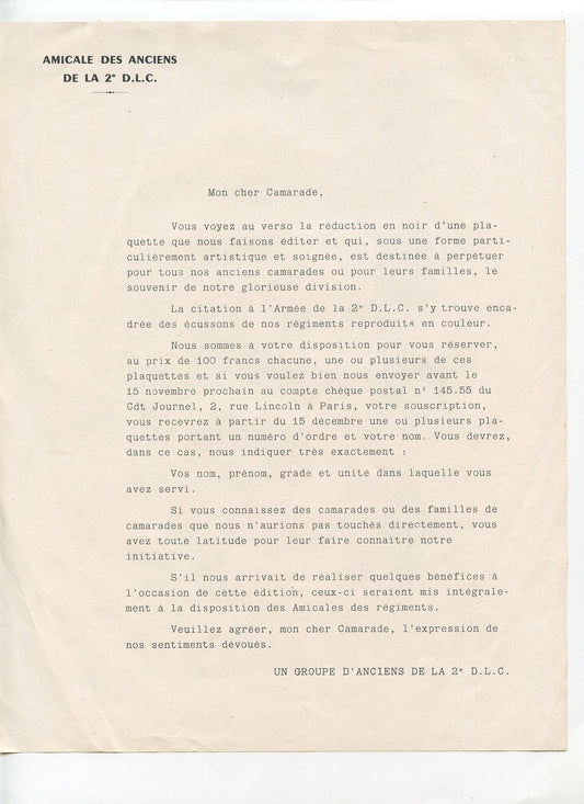citation imprimée à l'ordre de l'armée 2° division de cavalerie 1939-40, avec insignes, amicale