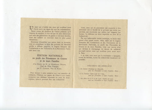 tract gravure du maréchal Pétain vente au profit des prisonniers Etat Français 1940-45