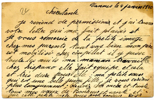 1939-1945 : CPA souvenir de Vannes 507° Rgt de chars de combat écrite en 1940