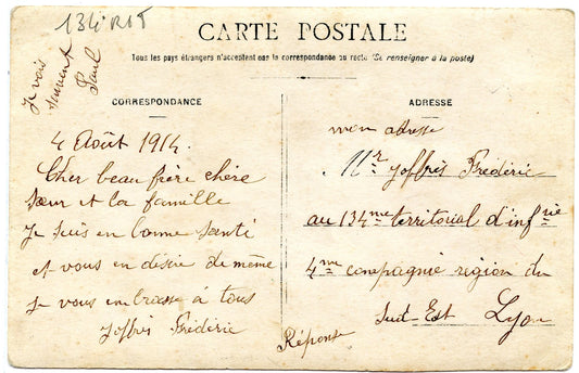 carte photo d'un groupe de poilus du 134°RIT jour de leur mobilisation 4 aout 1914