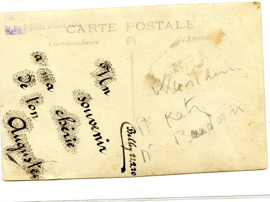 carte photo d'un poilu redescendant des lignes équipé capote Poiret vers 1915 texte au dos