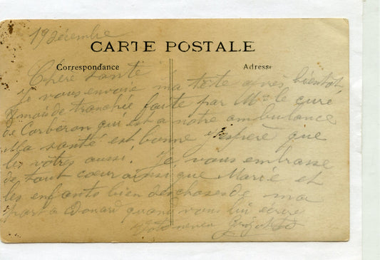 carte photo d'un poilu redescendant des lignes équipé capote Poiret vers 1915 texte au dos