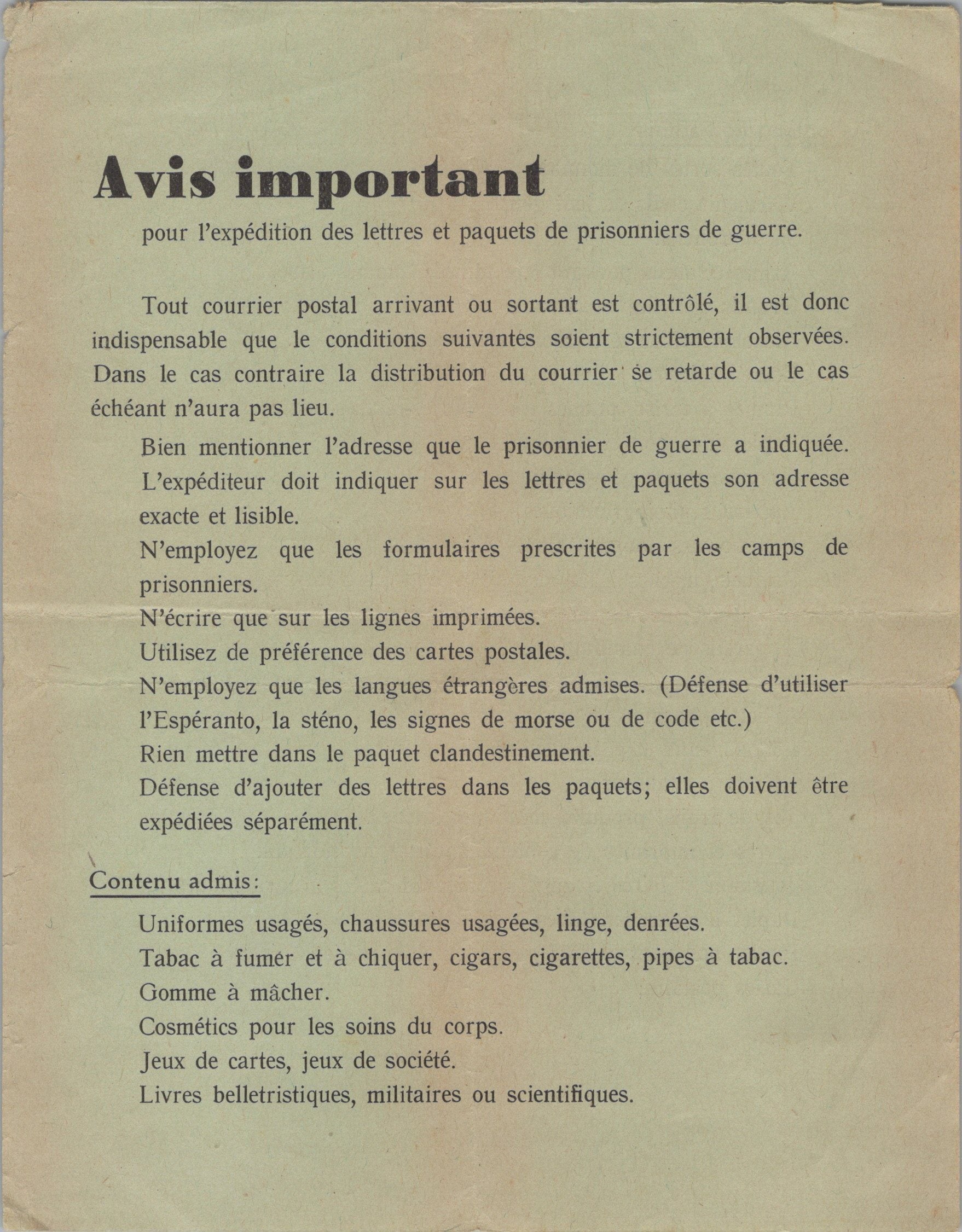 avis important pour l'envoi des lettres et colis aux prisonniers de guerre 1939-45