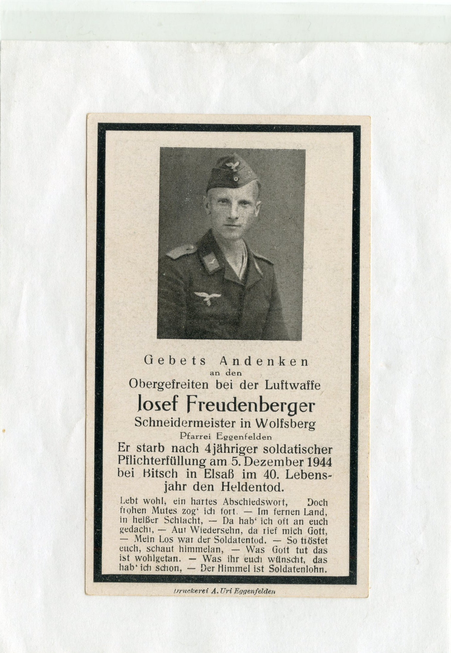 carte avis de décès d'un soldat allemand Luftwaffe tué en décembre 1944 à Bitche en Moselle