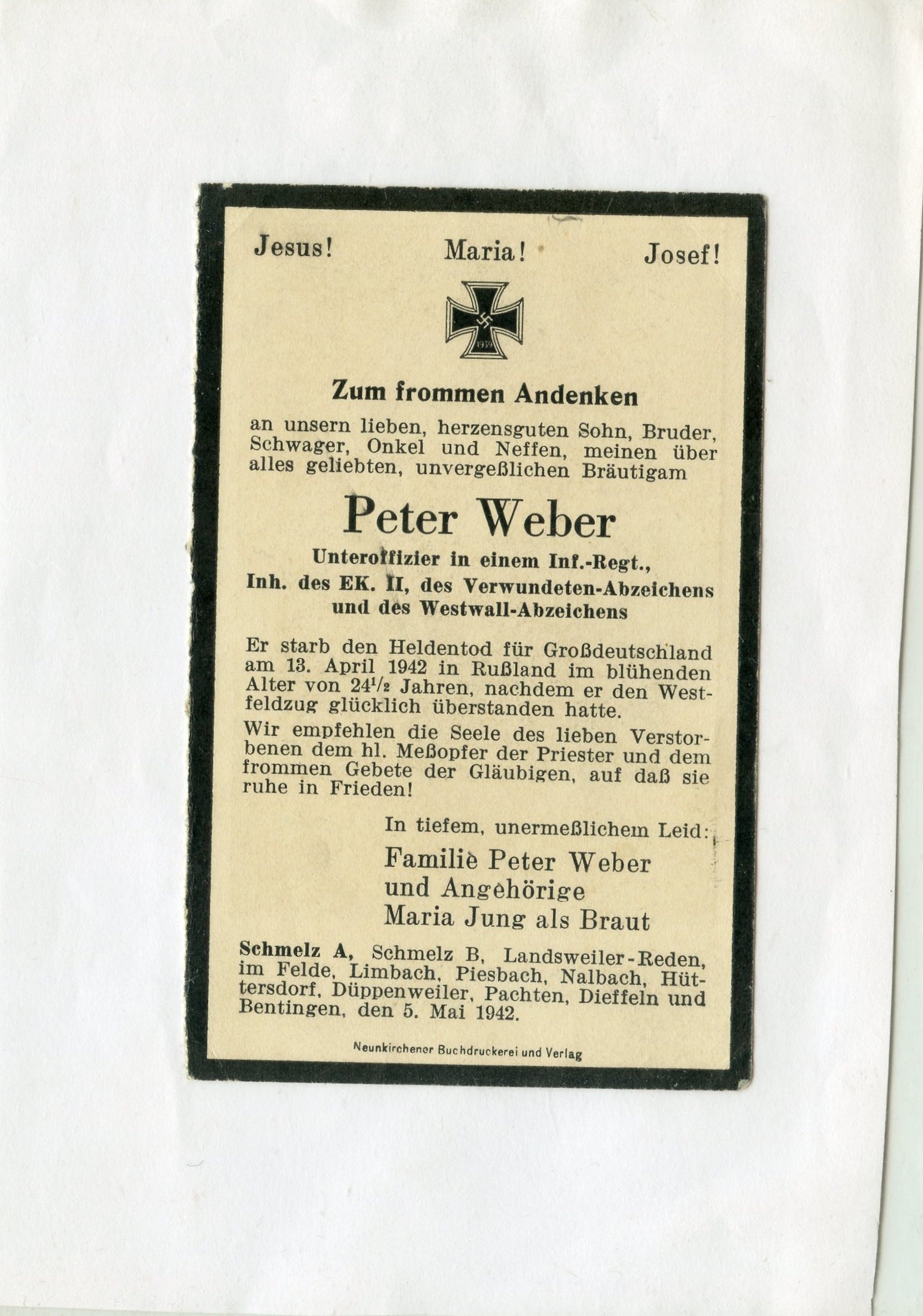 carte avis de décès d'un soldat allemand tué en 1942 en Russie décoré de la croix de fer et d'autres récompenses