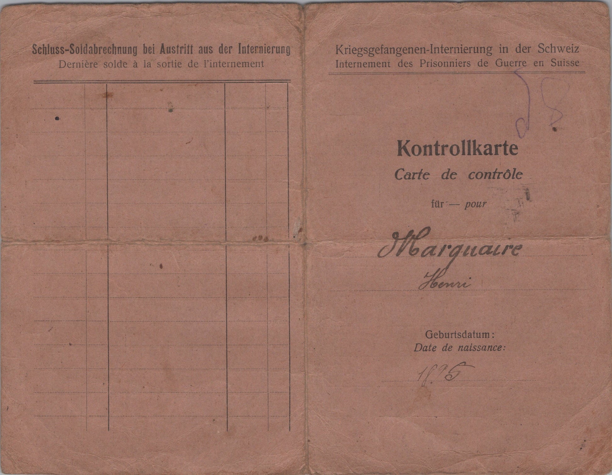 carte de contrôle pour un prisonnier civil Français originaire des Vosges en Suisse 1916