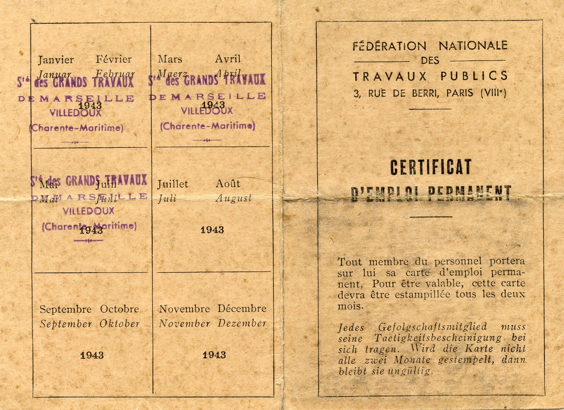 carte d'emploi permanent travaux publics état français 1943 Etat français