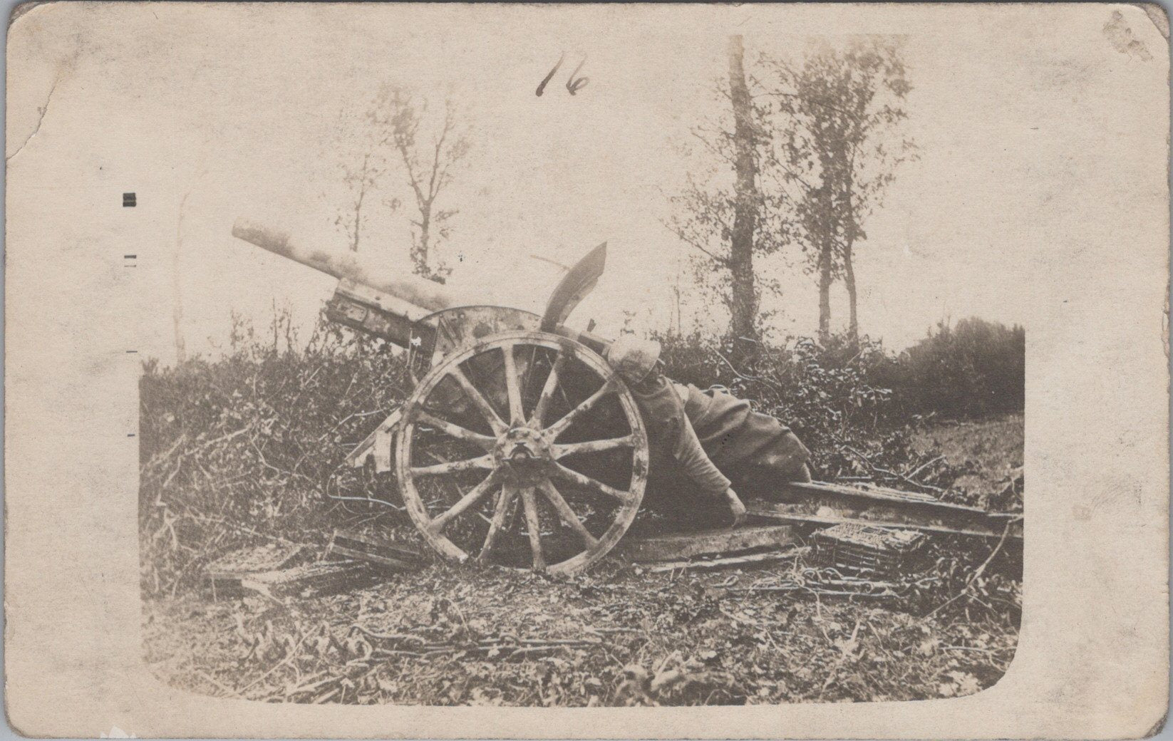 carte photo d'un soldat allemand en Stalhelm tué sur sa pièce d'artillerie