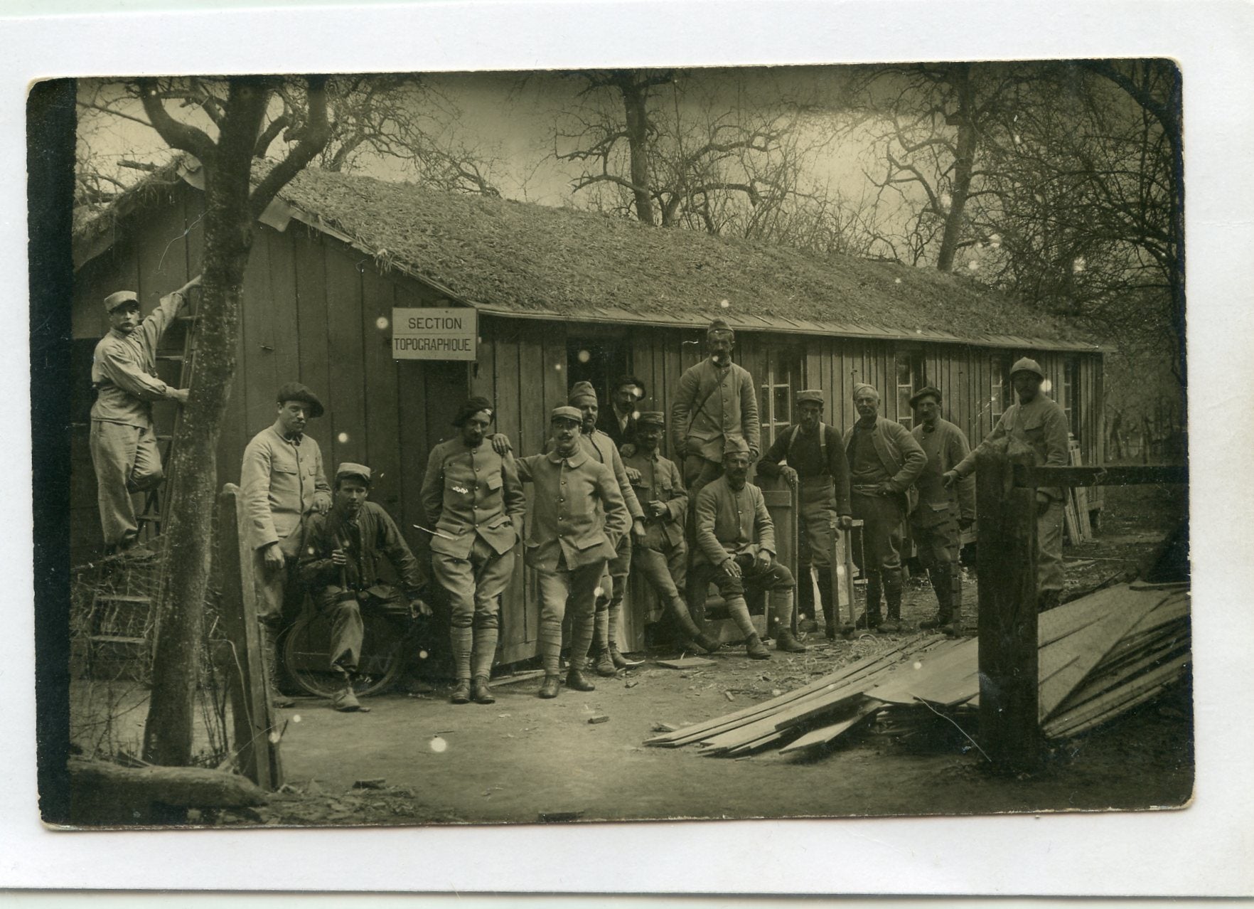 carte photo soldats français section topographique devant une baraque 1914-1918