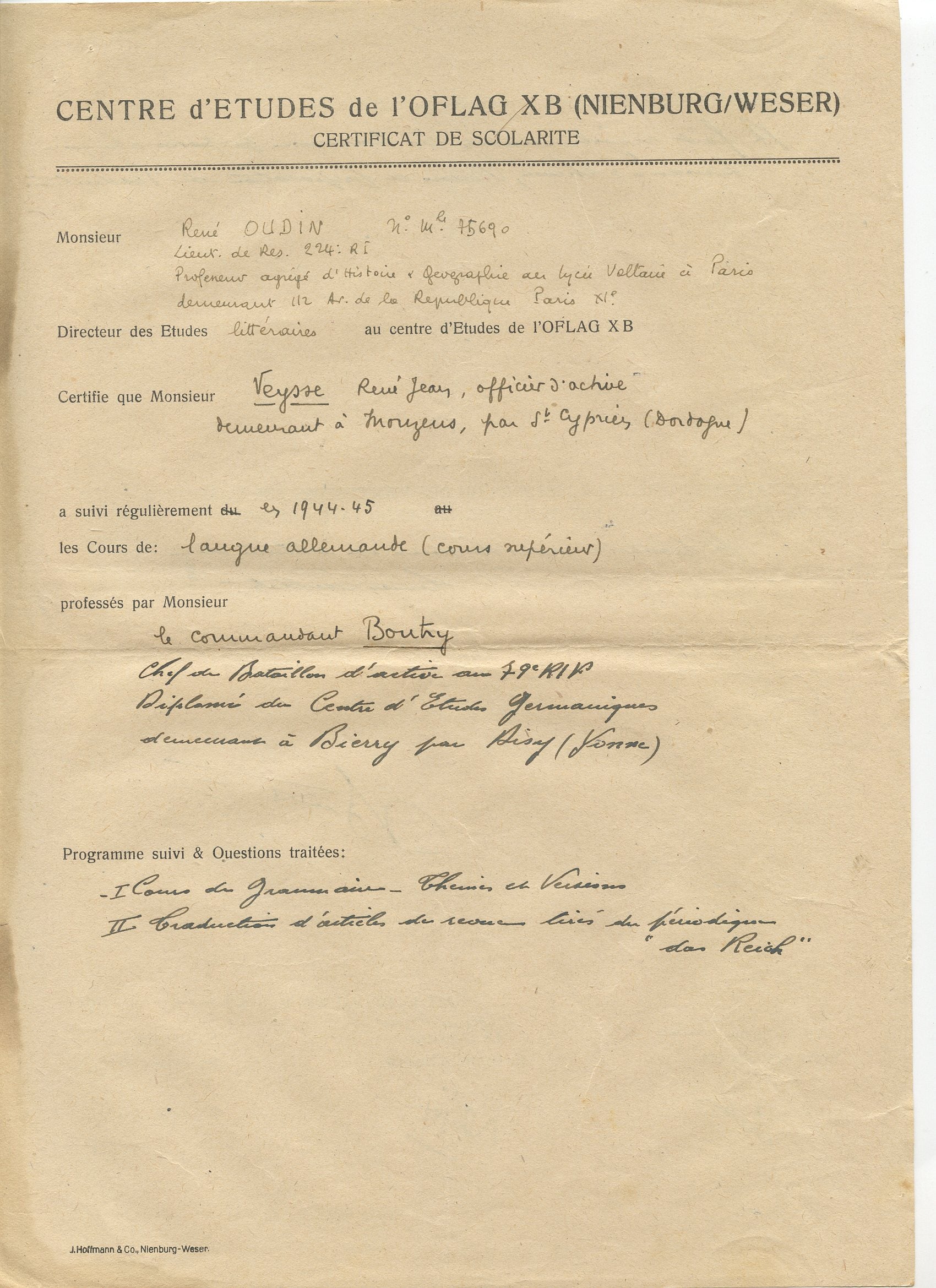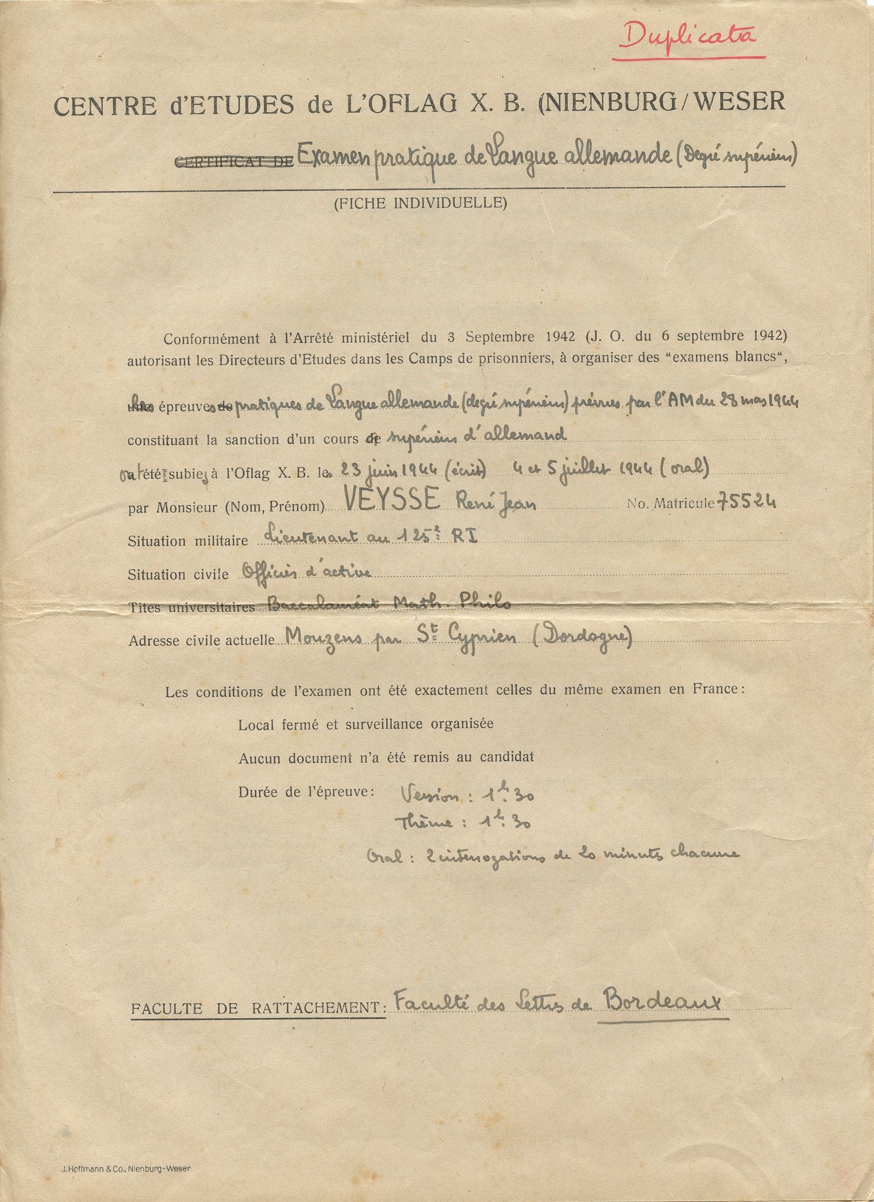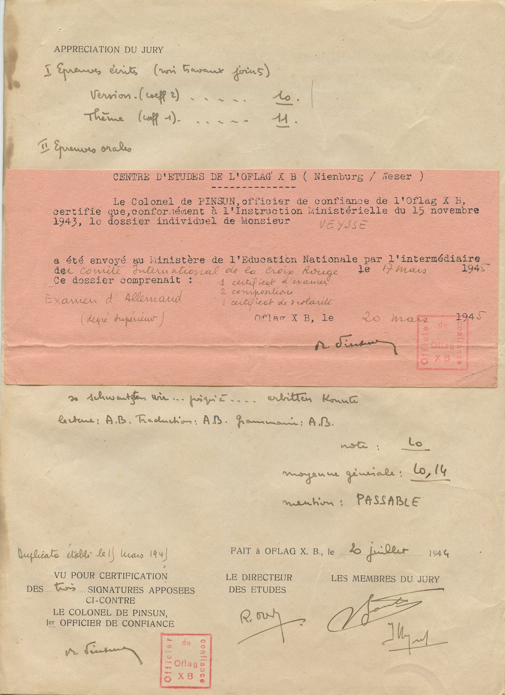 documents d'examens de langue allemande pour un officier prisonnier dans un OFLAG 1944
