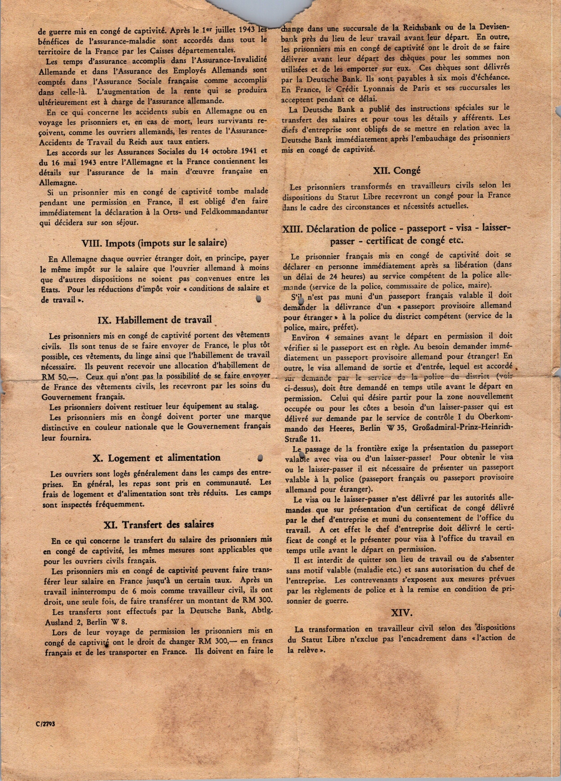 instruction pour les prisonniers de guerre mis en congé de captivité 1939-45