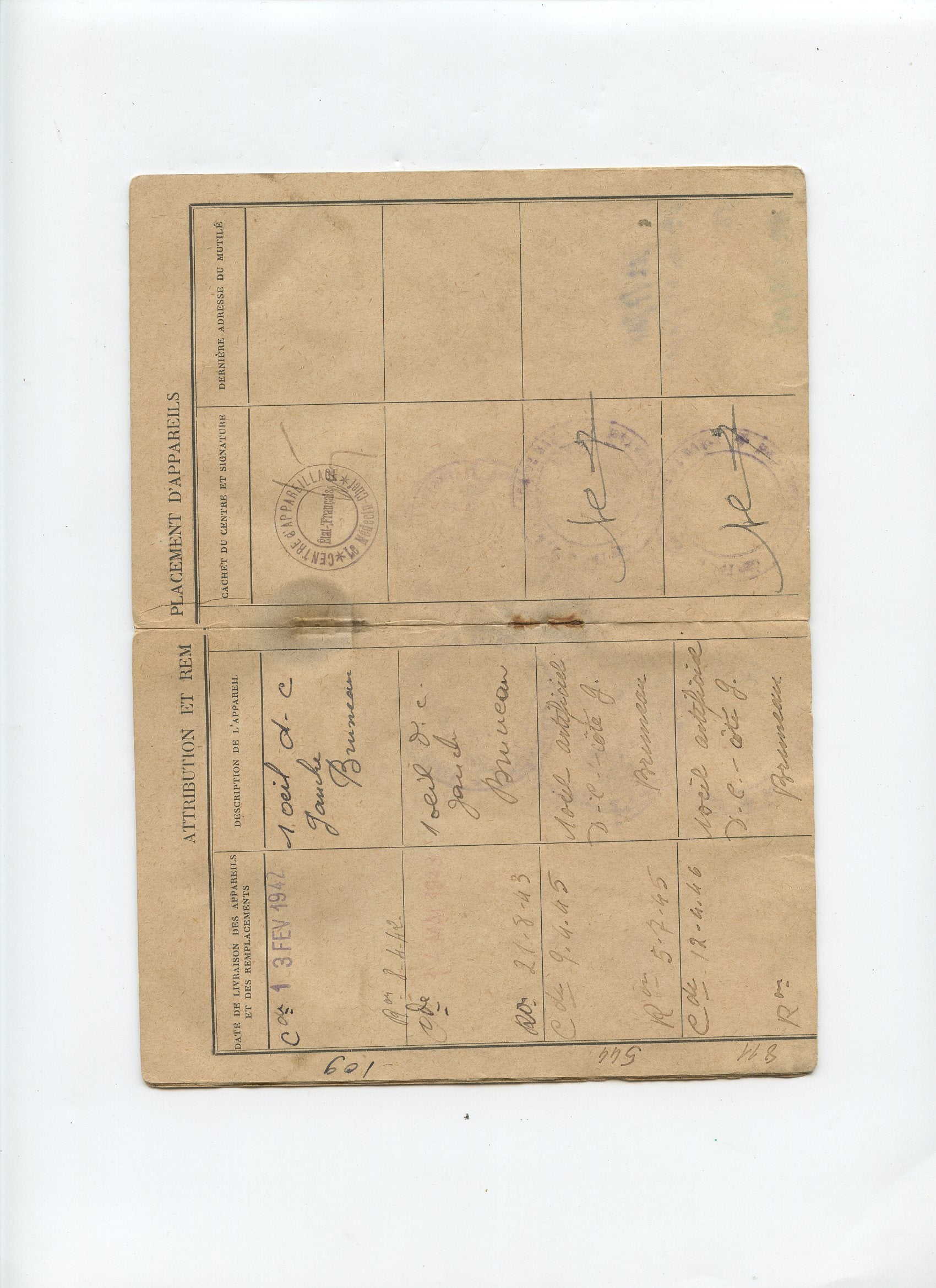 livret d'appareillage de blessé de guerre 53°RA et 221°RA 1914-18, perte d'un œil