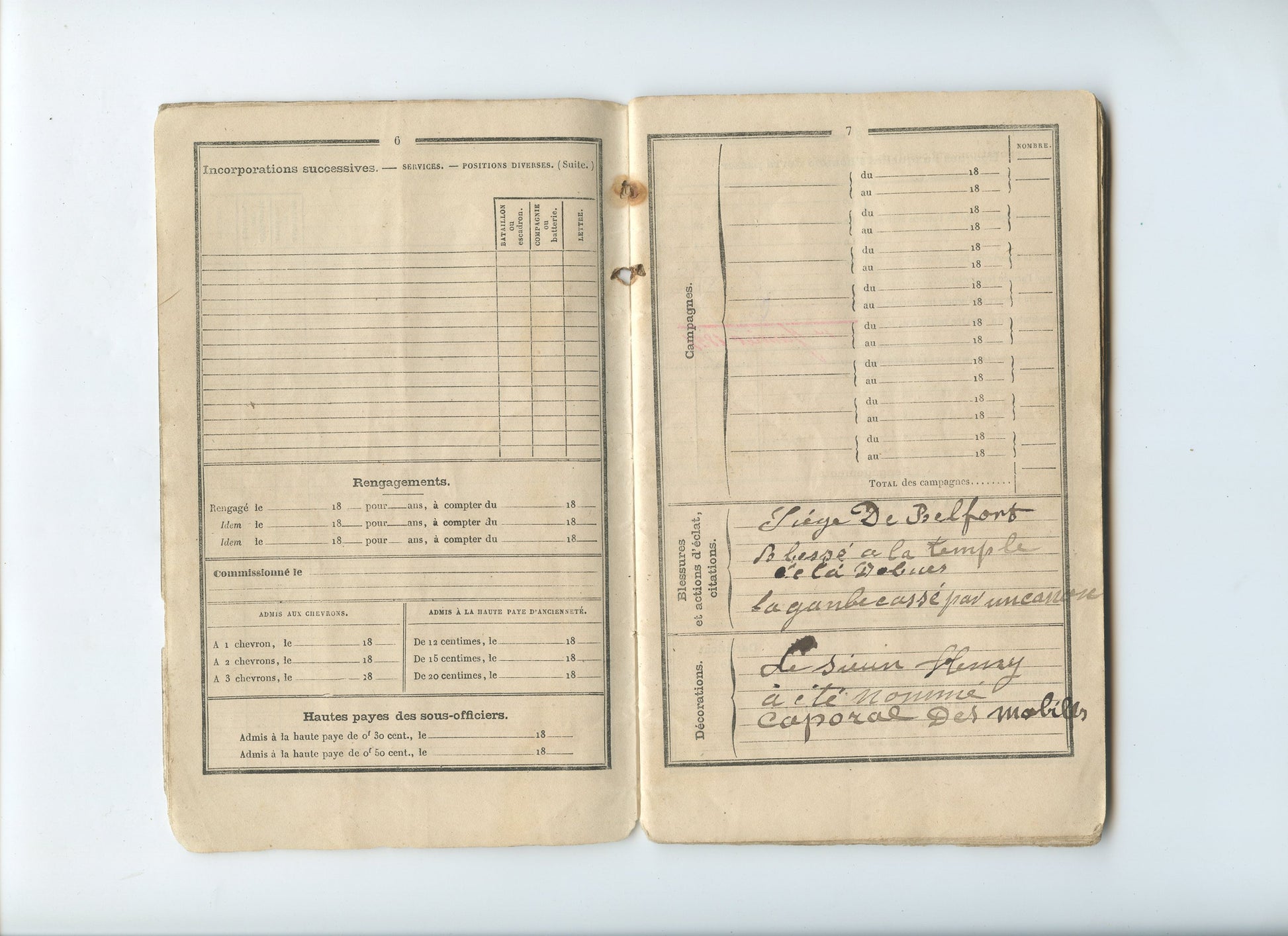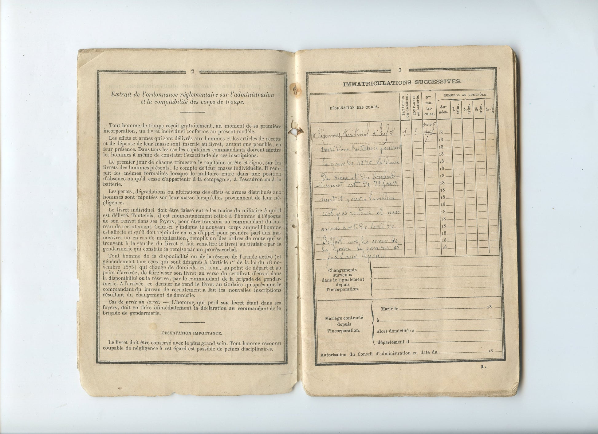 livret militaire soldat de haute Saône artilleur campagne de 1870, annotations intéressantes siège de Belfort