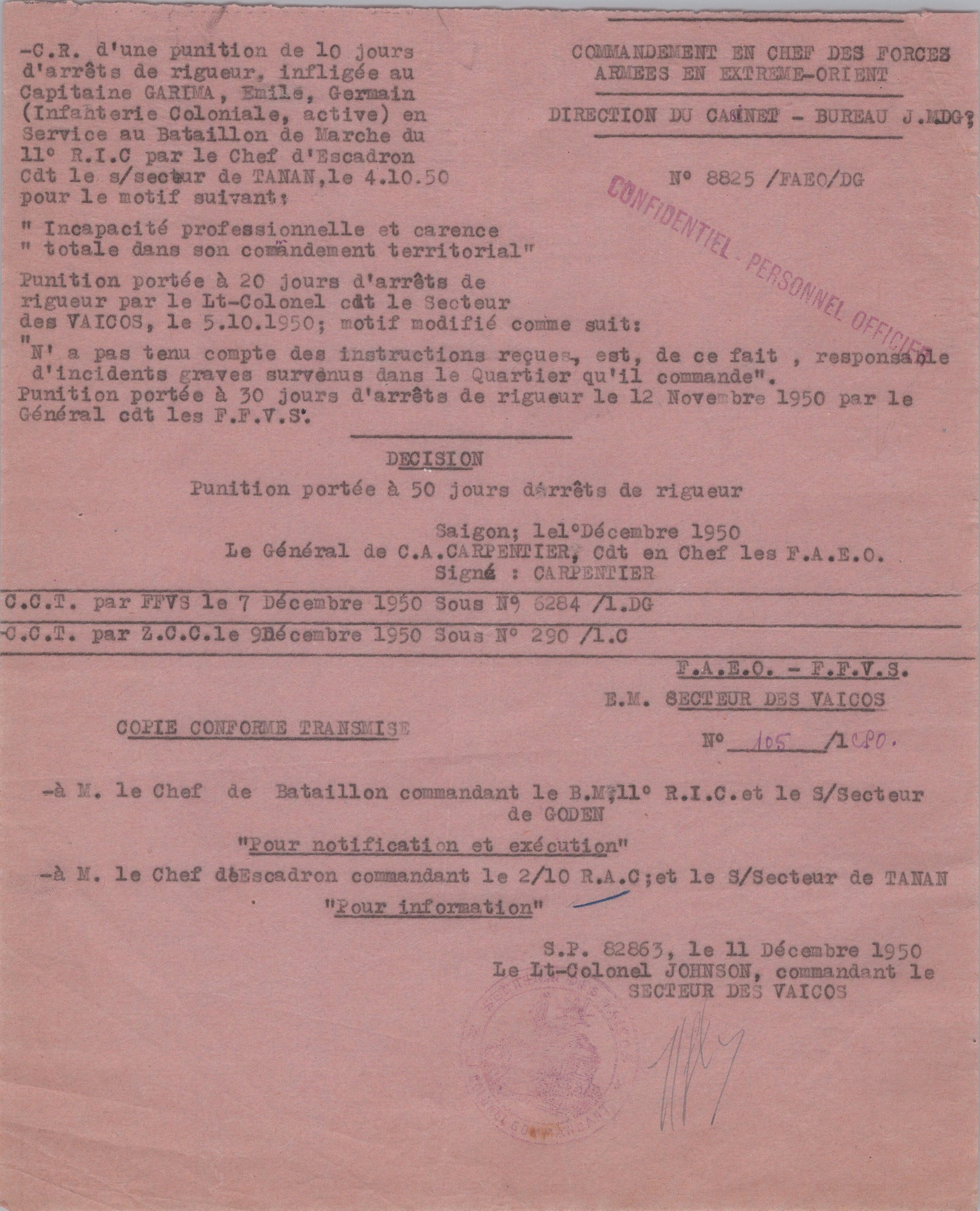 punition pour un capitaine de la coloniale en Indochine 11°RIC 1950