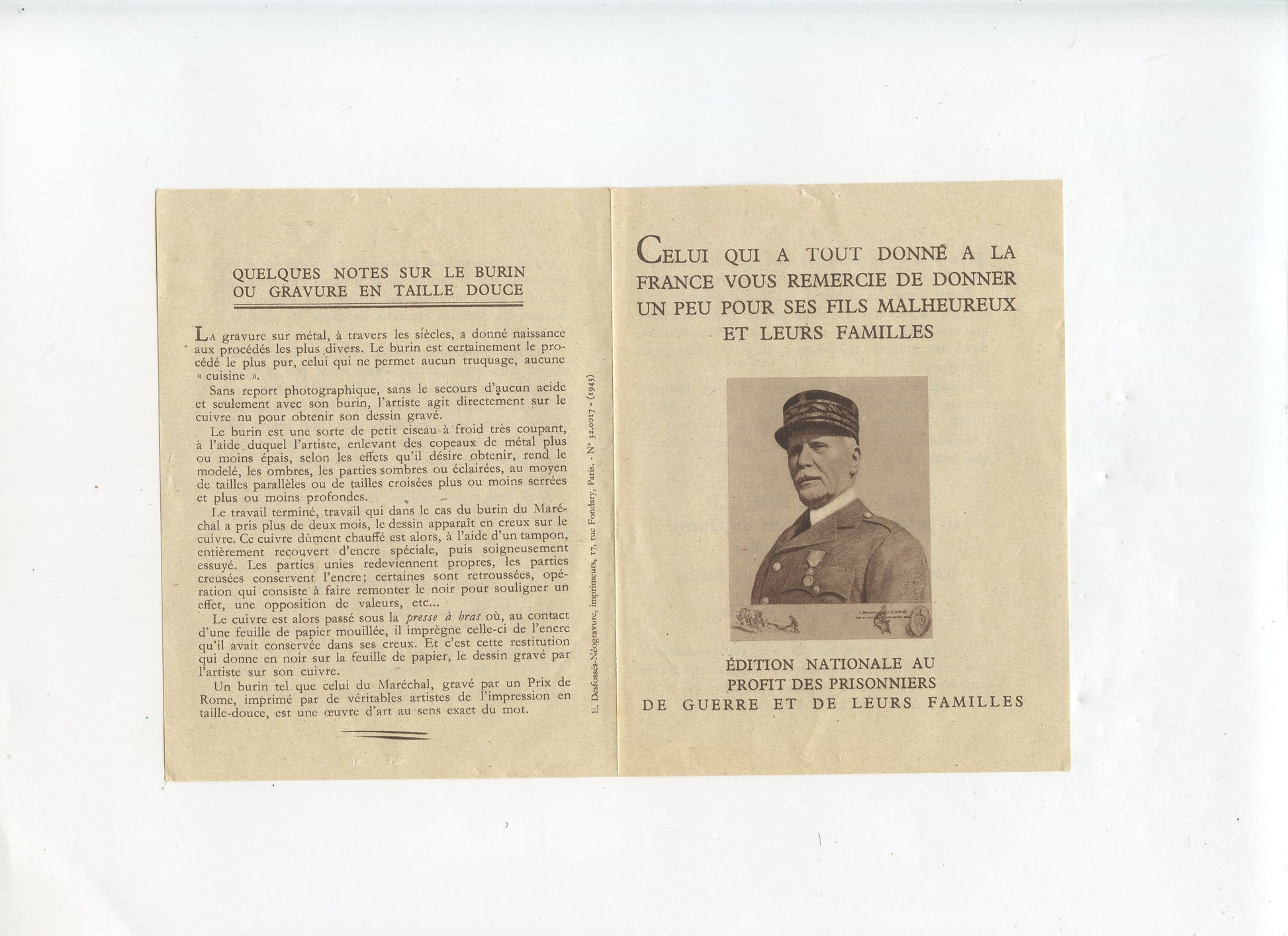 tract gravure du maréchal Pétain vente au profit des prisonniers Etat Français 1940-45